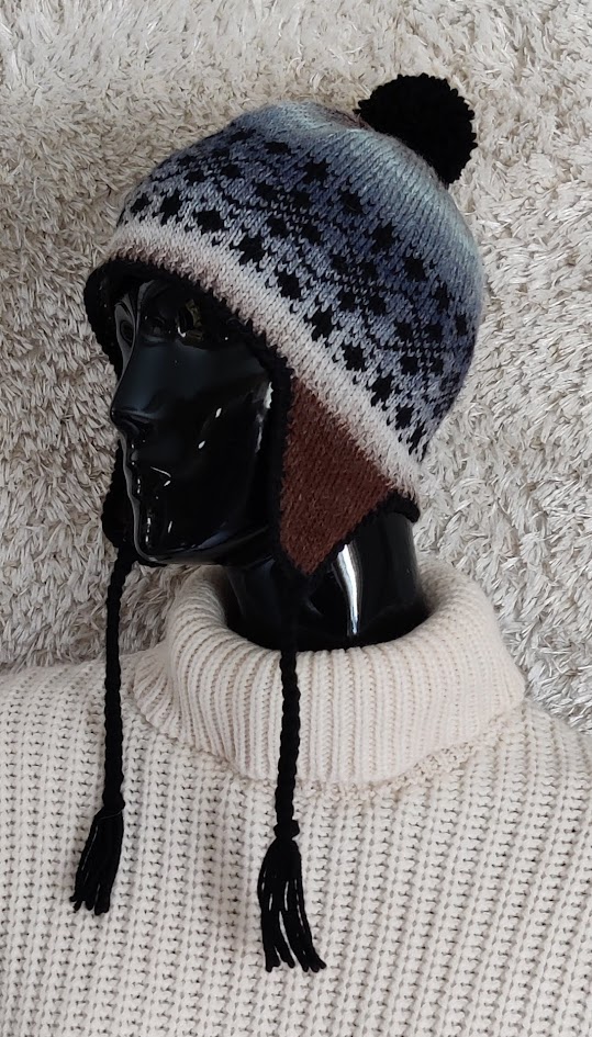 Sinisen ja ruskean sävyinen, korvaläpällinen kevyt retropipo kevääseen tai syksyyn.