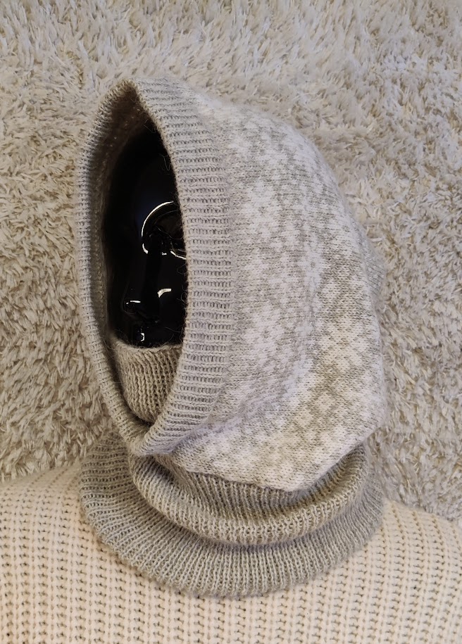 ”Pakkaspäivä” harmaa huppukauluri resorilla, 100% perulaista alpakanvillaa, yksi koko. Alpakanvilla ei kutita ja sopii näin myös herkkäihoiselle.