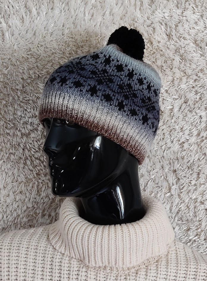 Kevyt sinisen ja ruskean sävyinen pipo kevät- tai syyskäyttöön, kun korvat kaipaavat hieman lämmikettä.