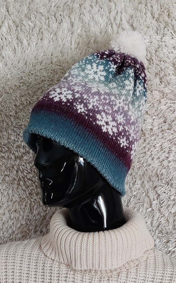 Violetin sävyinen myssy, jossa kaksinkertainen neulos reunassa lämmittää mukavasti korvia ja niskaa.
