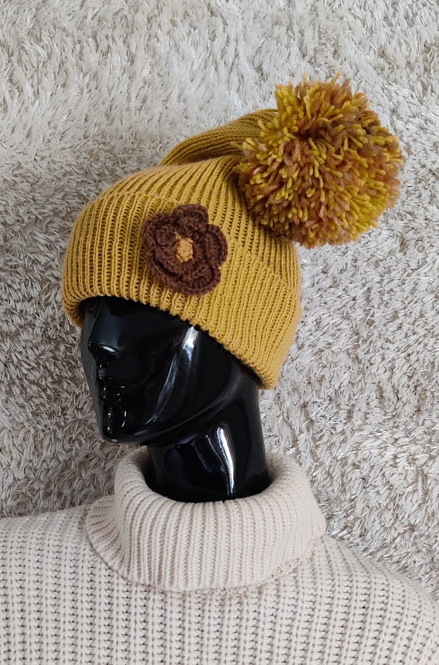 Okran värinen Tupsu-pipo (kukka kuvituskuva, ei myynnissä). Pitkä pipo, jossa jättitupsu. Pipon reunan voit kääntää jopa 4-kertaiseksi .